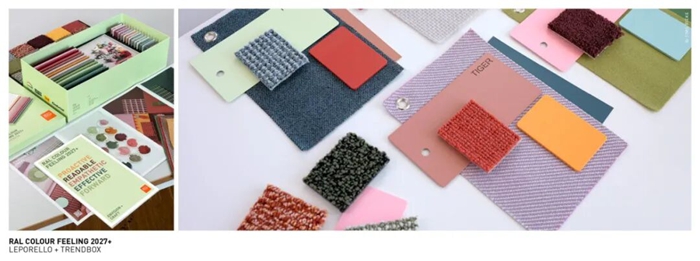 同时推出的RAL趋势材料套盒将这一概念付诸实践。该套盒包含全部15个趋势色,包括RAL D6单页标准色样、粉末涂层金属样品、塑料样品以及纺织品和地毯样品。这种触觉组件对于深思熟虑的设计决策至关重要。