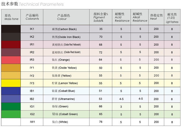 Due to the excellent environmental friendliness of inorganic pigments, as well as their outstanding acid and alkali resistance, weather resistance, and high temperature resistance, they can be used in coating systems with high alkalinity, such as inorganic silicate coatings and silicone resin coatings with excellent weather resistance. This product is also suitable for use in industrial product systems.